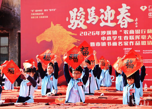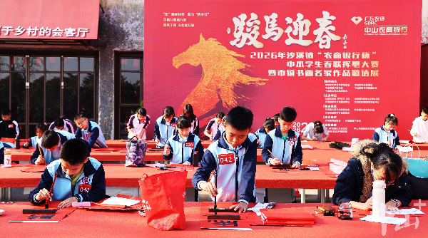 2月11日上午,2026年沙溪镇“农商银行杯”中小学生春联挥毫大赛暨市镇书画名家作品邀请展,在沙溪镇圣狮创意园开幕。此次活动由市文联、市书协等单位联合指导,市驻沙溪镇村“百千万工程”工作队、镇宣传和教体文旅办等单位主办,沙溪镇文联、圣狮村村委会协办,沙溪镇书协、美协承办,中山农商银行沙溪支行等单位支持。市镇相关领导、书画界名家与师生以及家长代表齐聚一堂,共赏翰墨风华,共迎马年新春佳节。