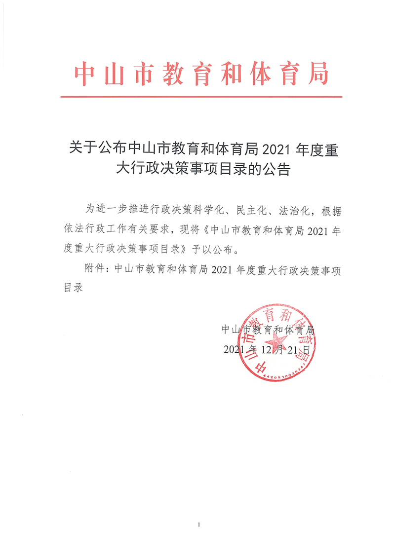 关于公布中山市教育和体育局2021年度重大行政决策事项目录的公告