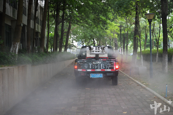 中山市消毒管理站的消杀车在中山市实验中学内进行蚊虫消杀。记者 缪晓剑 摄