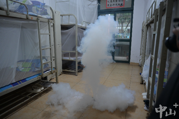 中山市实验中学的学生宿舍早、晚两次用烟雾进行灭蚊。记者 缪晓剑 摄